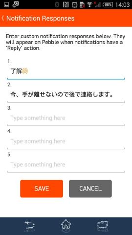 Pebble Timeアプリケーションのテスト確認用通知ですので英語で表示されていますが、実環境では全て日本語で表示できています。