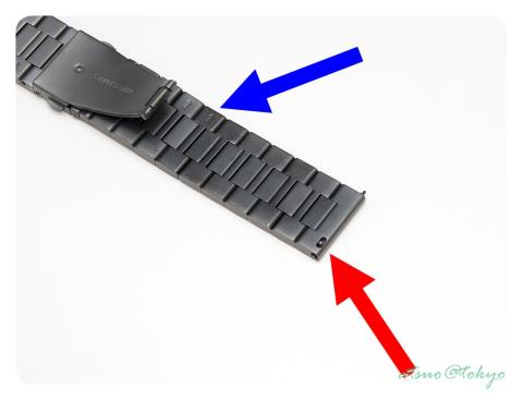 長さ調整は青矢印の先にある矢印マークの側面にマイナスドライバで外せるピンがあるので、腕の太さに合わせてコマを外してやります。