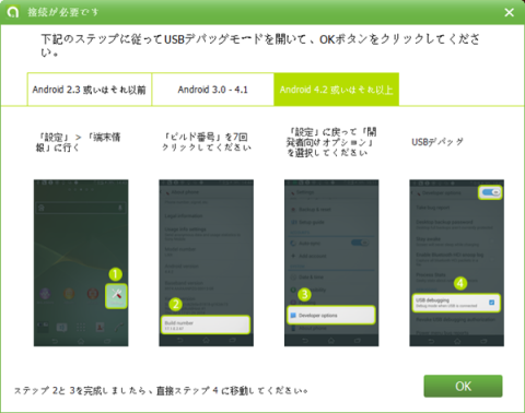 まぁ、今はとにかく連絡先の復元だ、と思って、「無料試用」のボタンを押した。スマホとパソコンを接続すれば、自動的に認識されます。あとはスマホをデバッグモードに入る必要があります。iPhoneユーザーですのであまり詳しくないですが、ずっとAndroidを使っている友人自身もさっぱりわからないらしい、使えない奴だな。幸いソフトと公式ページにはスマホの電話帳を復元するための詳しいチュートリアルがあって、説明通りにやったら無事成功しました。