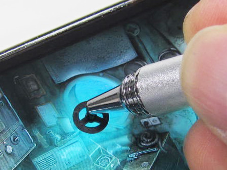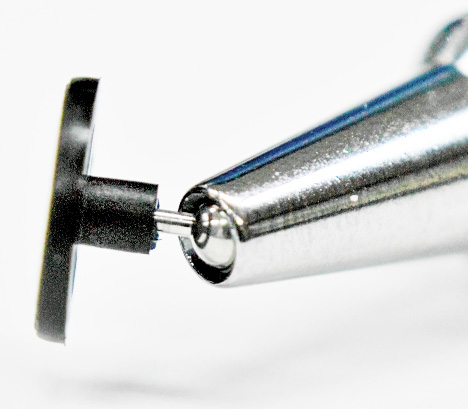 そして、最も特徴的なのがこの黒いステアリングホイールのような形の樹脂製の先端部分です。この先端部分がタッチパネル面に均一に接するためにペン先の軸の付け根部分にボールジョイントが仕込まれていて、手の動きに追従するように作られています。