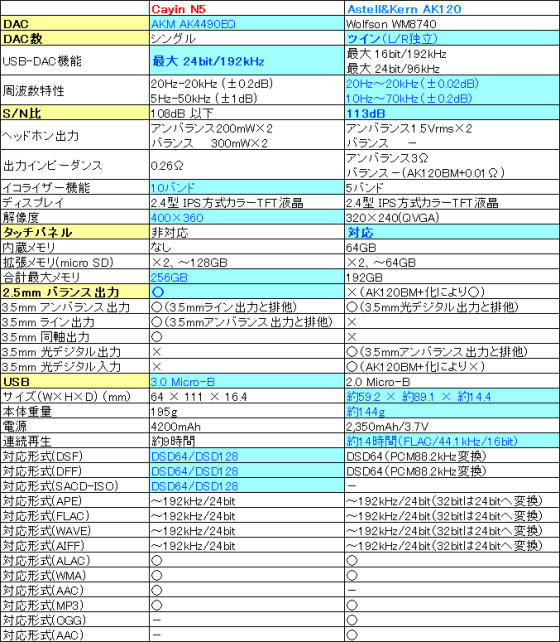 ■Cayin N5とAK120(一部AK120BM+)との比較