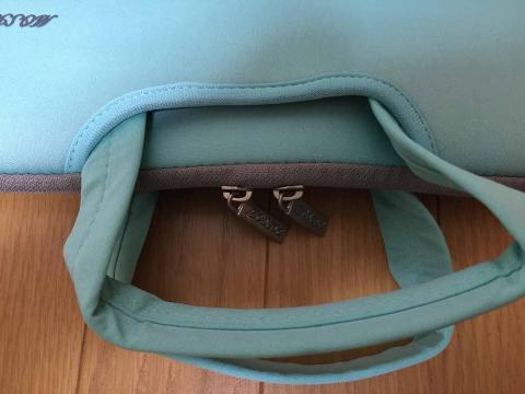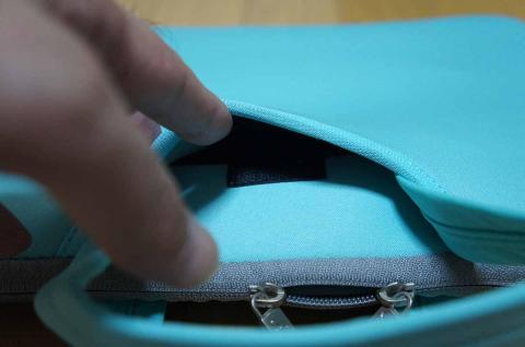 ここもツボを押さえていますね。ポケット内部に、マジックテープを貼ってあります。これは、スリーブケースとして使った場合、取っ手が外に出ないようにしています。また、このポケットに入れたものが、外に出ない役目もしています。この形状のノートパソコンケースでも、意外とこのマジックテープを貼っていないものを見掛けます。