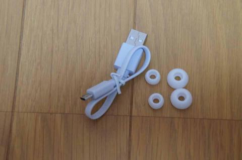 充電用ケーブルと、装着済みのものを含めて、3種類のイヤーパッドが付属しています。