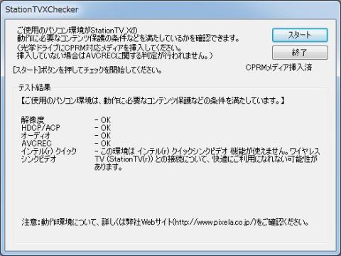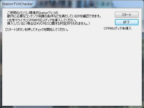 DVDドライブに録画用(CPRM対応)のDVDメディアを入れて「StationTVR X 環境チェッカー」の「スタート」をクリックします。