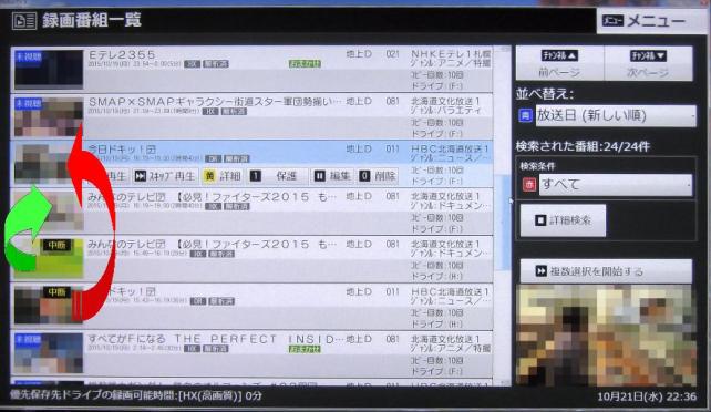 録画番組一覧です、録画途中でドライブが一杯になった番組にはサムネイルに「中断」メッセージが表示され矢印の位置に別ドライイブに振り替え録画されているのが分かります。
