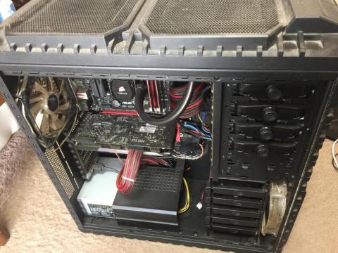 メーカーやケースによってサイドパネルの開き方は違うのですが、私のケース(Cooler Master HAF-X)は背面のネジを回し、向かって左側のパネルを開きます。