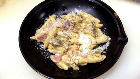 【ベーコンとマッシュルーム、生クリームと卵黄でカルボナーラ風に】