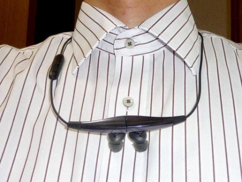 ネックバンドと言うか、ネックストラップ式でワイヤレスなので、耳からイヤホン外すと左右に垂れ下がってるだけで、ずり落ちちゃう危険性があります。