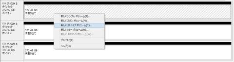 ダイナミックディスクに変換されたので、右側を右クリックし、新しいストライプボリュームを選択