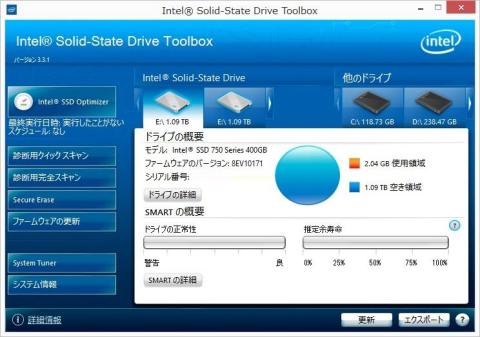 まずIntel SSD ToolBOXにてファームウエアを見てみましょう