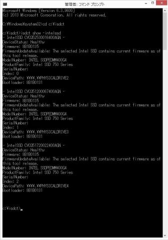 「isdct show -intelssd」を入力するとSSDリストが表示されます(私のは3台)