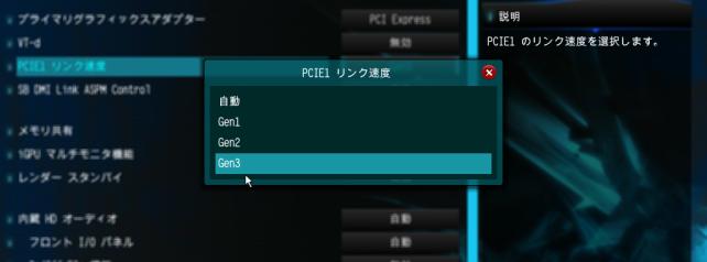 「PCIE1リンク速度」が「自動」になっていたためで「Gen3」を