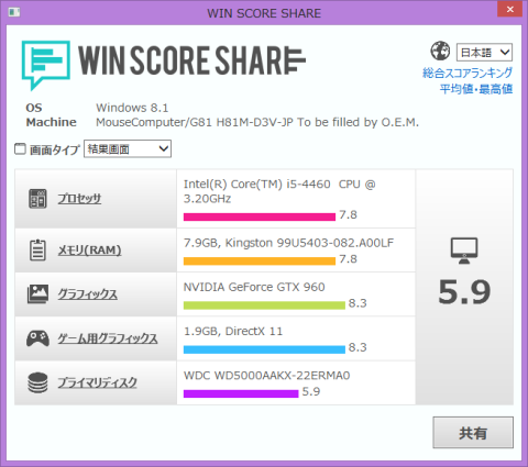 今度はCPUとメモリの7.9というスコアが足を引っ張る形でトータルスコアは7.9になりましたが、グラフは均一になり非常にバランスの良いスペックになりました。