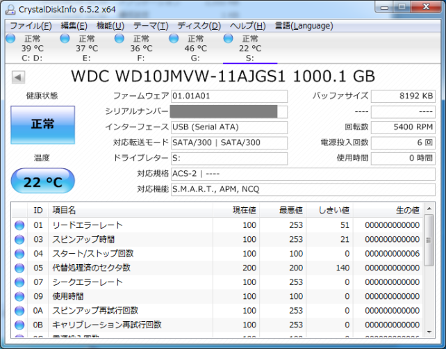 ドライブ名はWD10JMVW-11AJGS1という型番で、これまでに見たことのないものでした。てっきり通常の2.5インチWD Blue辺りが入っているのかと思っていたのですが、どうやらポータブルHDDの専用型番となっているようです。