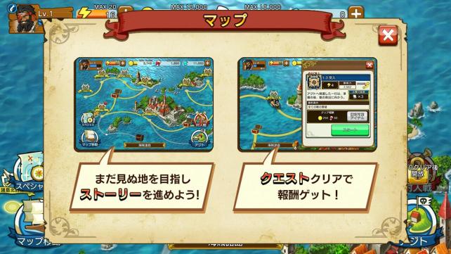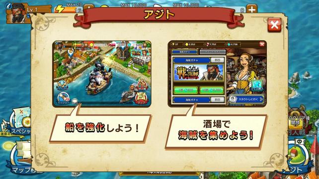 スタミナを消費してストーリーを進め、バトルで得たゴールドやフード、アイテムなどを使い海賊や船を強化したりする場所がアジトとなります。