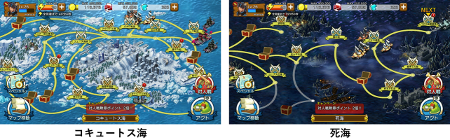 現在、開放されているのは以下の6つの海域(マップ)「海賊諸島」「フォールンラグーン」「煉獄の海原」「アクアレス群島」「コキュートス海」「死海」となります。