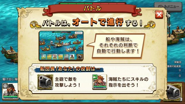 バトルは、オートで進行するので、自分が操作するのは、母船の主砲と各海賊たちのスキルの発動のみとなります。