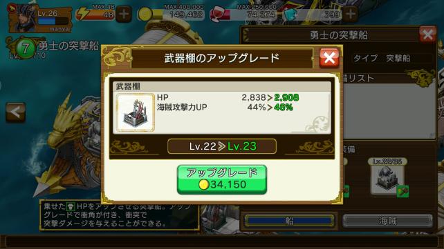 アップグレードすると大幅にHPが上昇したり、乗船した海賊へのプラス効果の割合が高まるなどの効果があります。