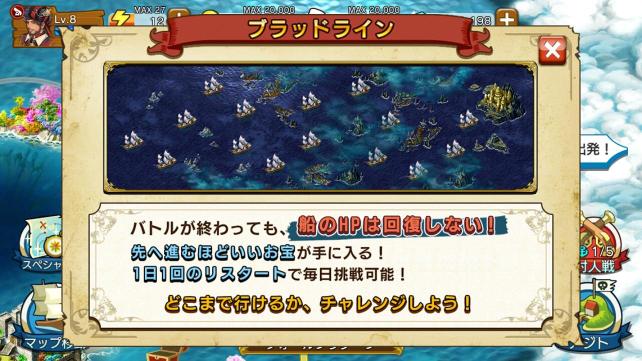 通常のクエストでは1つのバトルが終わると、船や海賊のHPは回復するのですが、ブラッドラインでは回復しません。