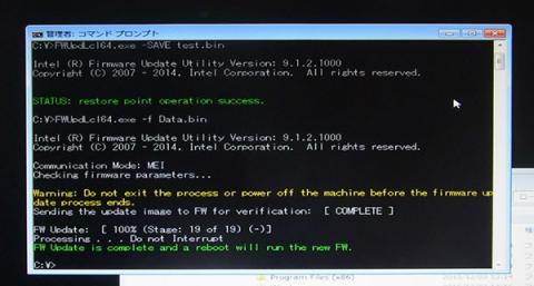 コレを管理者権限のコマンドプロンプトで実行。まずはテストも兼ねて -SAVE (任意のファイル名).binを実行して現在のMEのバックアップが正常に行われるか確認。今回は無事バックアップされたのと、書き込もうとしているData.binのファイルサイズがバックアップしたものと同じだったのでGo。ここで何か不安だったらやめとこう。