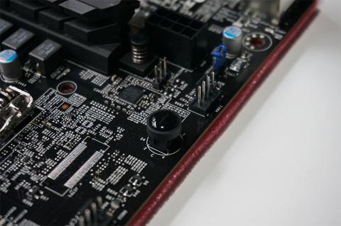 各所に点在するジャンパピンは最近のマザーとしては非常に多い。USB給電からオーディオのオンオフまで物理的に切り替える。手前の黒丸は電源スイッチでLED内蔵。