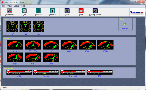 当初「CPUの温度を見るソフトも無いので適当なソフトを拾ってくる必要がある」と書きましたがコメントで情報頂いたSupermicroマザー用監視ユーティリティ「SuperDoctor III」が使用できました…というかよくみたら付属ディスクにさりげなく入っていたのでお詫びして訂正致します。