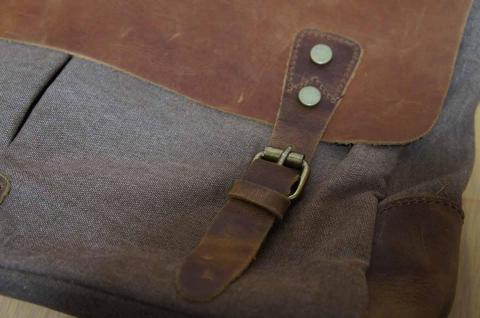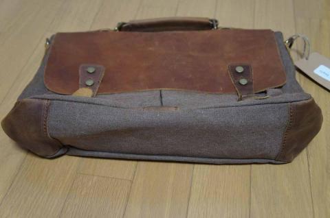 帆布がメインで、取っ手やふた、底の部分的に牛革を使用。牛革はわざとダメージを与えており、ビンテージバッグの雰囲気があります。