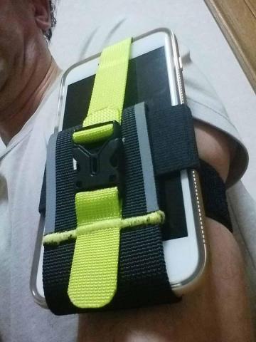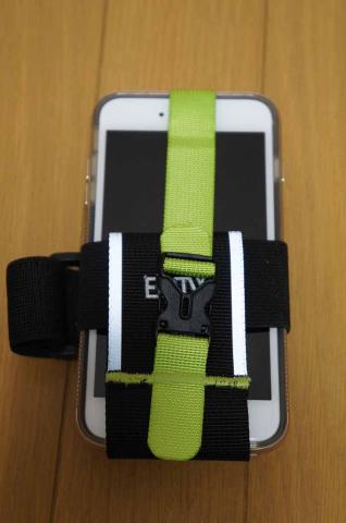 アームバンドとして使ってみました。腕に巻くバンドもゴム製で、太めなこともあり、圧迫感はありません。グレーのテープの部分は、反射材になっていて、安全面も考慮された製品です。