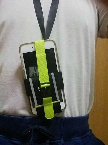アームバンドを取り外して、ネックストラップを付ければ、ご覧のように、首からもぶら下げられます。