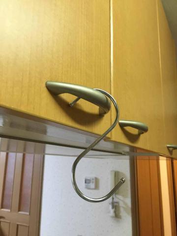 台所の収納扉の取っ手に使うと、結構重宝すると思います。ここに調理具やキッチングローブが置けます。