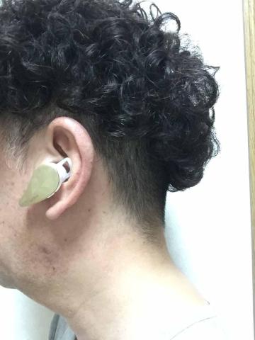 このように耳に装着します。デザインも変わった形をしていますが、それより色がとてもクールですね。意外とゴールドってないと思います。