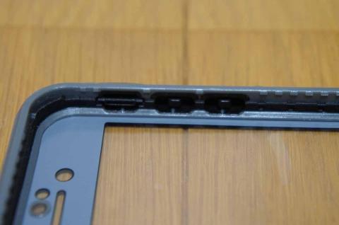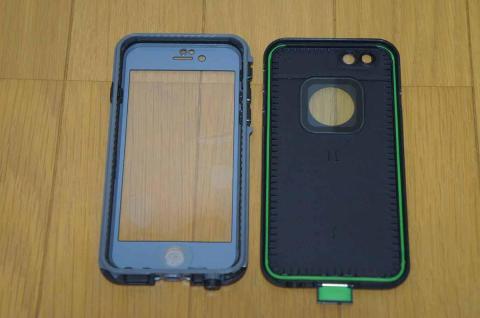 2層構造になっており、iPhoneを収納し、ケースの周囲にあるツメで固定されます。はめる際は簡単ですが、外す際は硬いので、Lightningの辺りからこじ開けてください。