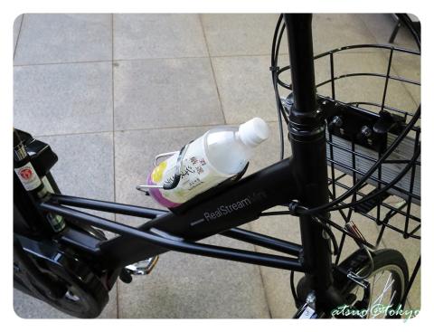 水平なフレームに設置だと 500mlのペットボトルだと抜け落ちそうで怖いですね。