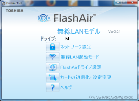 この画像の状態では、BSCR09U3WHのSDカードスロットに挿入して、その接続先となっているPCに設定ユーティリティである「FlashAir Tool」を導入して起動したときのものです。カードリーダーのSDスロット部に割り当てられていたドライブ名の「M」という表示が見えています。