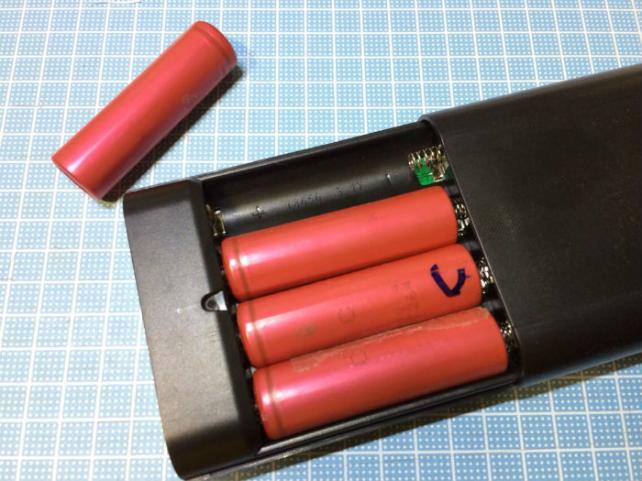 このセットには、バッテリーが付属しないので、別途購入した18650セルやノートPCのバッテリーパックから取り出したセルを使用しています。