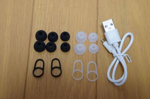 充電用のMicroUSB-USBケーブルとイヤーパッド、イヤーフックは豊富に付属しています。