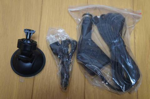 マウント、家庭内で使うためのMiniUSB-USBケーブル、シガーソケット電源が付属しています。