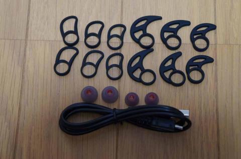 耳の中で固定するイヤーフックも、硬いもの、柔らかいものサイズ違いで合計6組付属しています。交換用のイヤーパッドも、2組付属し、充電用のMicroUSB-USBケーブルも付属しています。