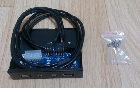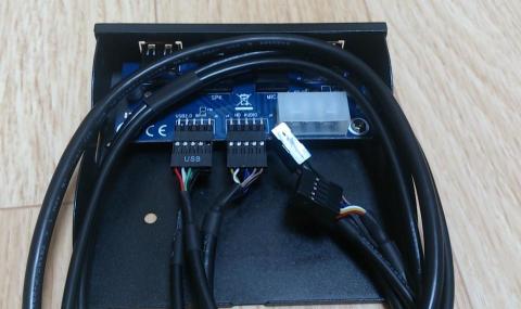 これは3.5インチベイにUSB2.0×2ポートとヘッドホン、マイク端子を持ってくることができます。いずれもマザーボードのピンヘッダから取るタイプなので最近のケースに付いているものと同じです。