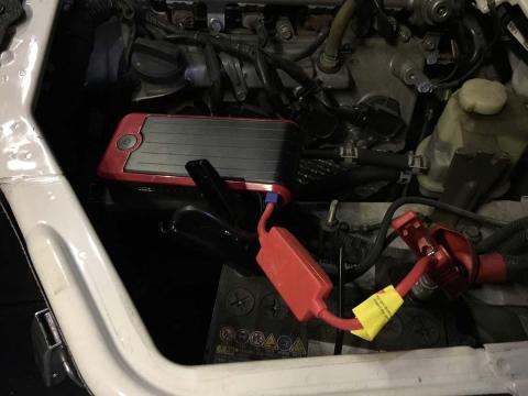車屋の友人に協力してもらい、バッテリー上がりの車で使ってみました。このジャンプスターターに限らず、赤(+)を先に接続し、その後に黒(-)を接続します。