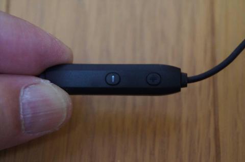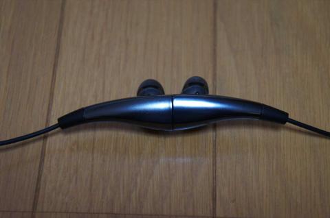 ケーブルの途中にあるコントローラ。表が電源ボタンです。電源のON/OFFと、再生/停止、着信/終話が行えます。