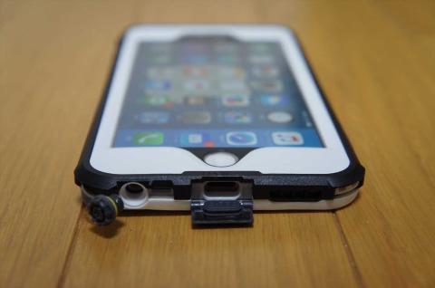 Lightning、イヤホンは蓋で閉じられます。イヤホンはねじ込み式で、付属のミニステレオ延長ケーブルもねじ込み式なので、極端な例ですが、水の中のiPhoneからイヤホンを使って音楽が聴けます。