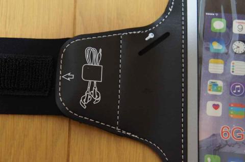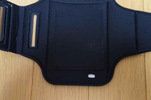 裏側には、イヤホンを通す穴と、カード入れを装備しています。裏面の素材も柔らかくて、通気性の良いものを使っています。