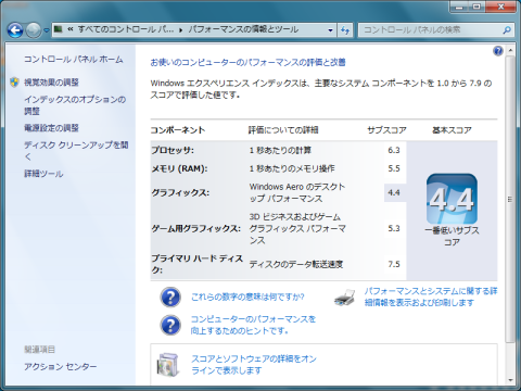 SSD換装後、Service Pack 1の適用などを終え、とりあえず実使用環境を整えてWindows Experience Indexを取得してみました。