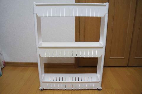 こういうすき間用収納ラックは、一般的にはキッチンで使うと思います。システムキッチンと冷蔵庫のすき間など。
