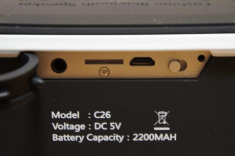 背面に電源スイッチ、充電用MicroUSBポート、オーディオ入力があります。特筆出来る点として、MicroSDが接続でき、直接再生できることです。この値段帯のBluetoothスピーカーで、MicroSDを直接再生できるものは、とても少ないと思います。