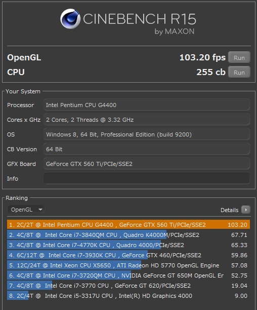 OpenGLにおいては、Pentium G4400はかなり良い結果でしたね。