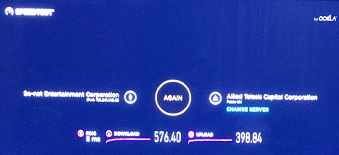 下り:576.40Mbps, 上り:398.84Mbps、Ping:5ms