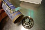 筒に取り付けられている金属棒の末端に、スイッチになる切り替えポイントのような部品があります。 この部品を動かして、前述の電池蓋に接触させることで、ニクロム線に電流を流す。