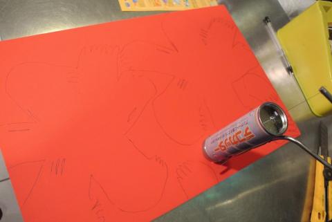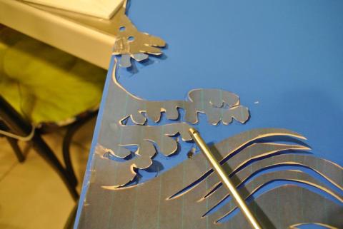 シートに型紙を仮固定し、それに沿うようにしつつデコカッターのニクロム線を進めます。